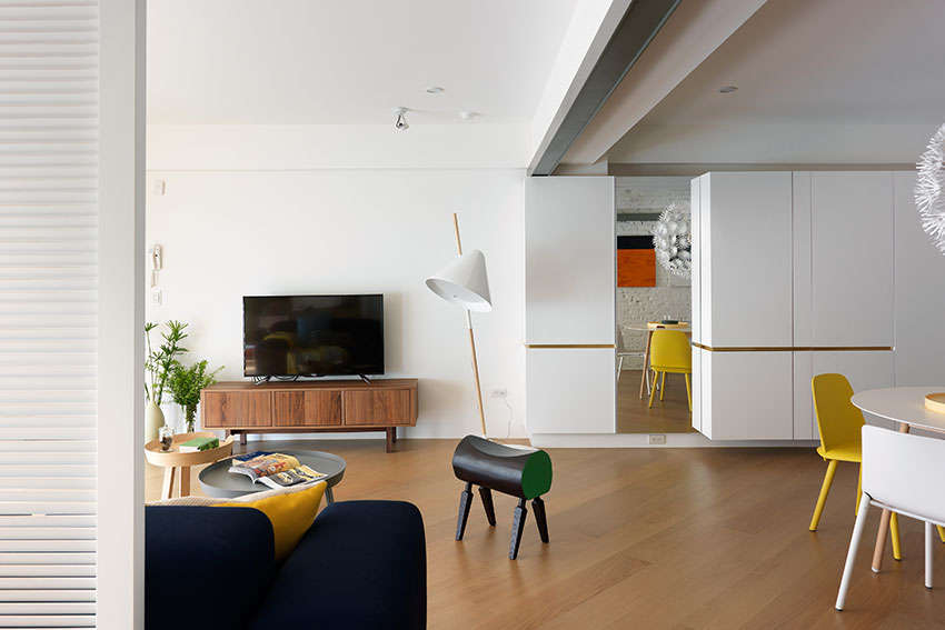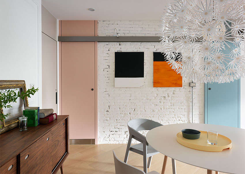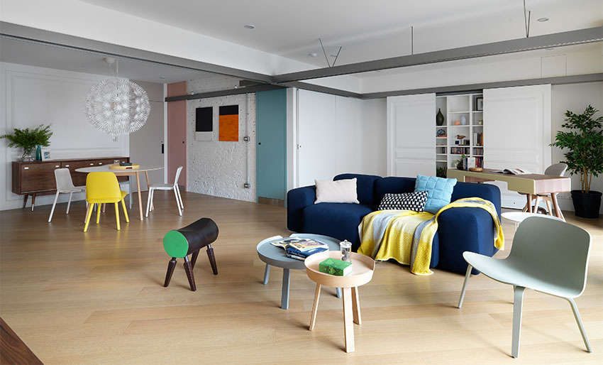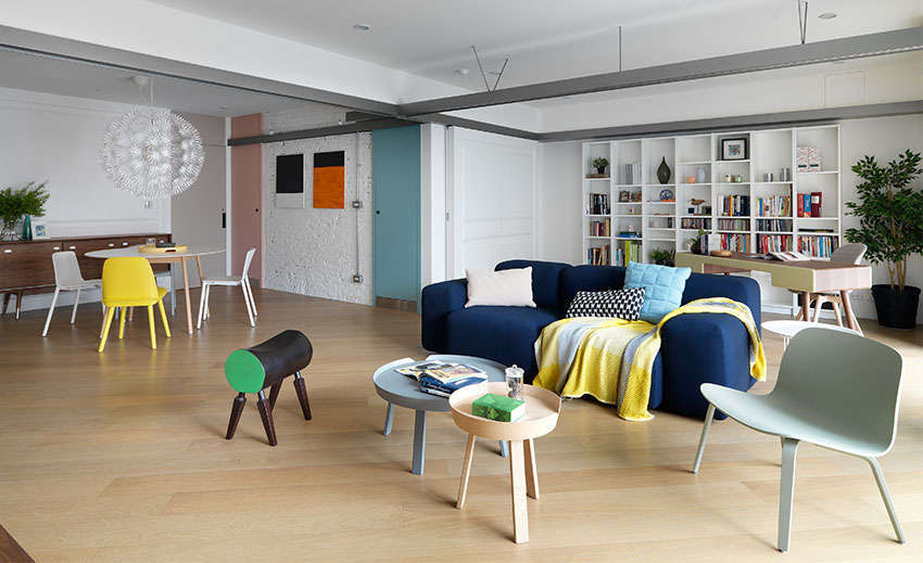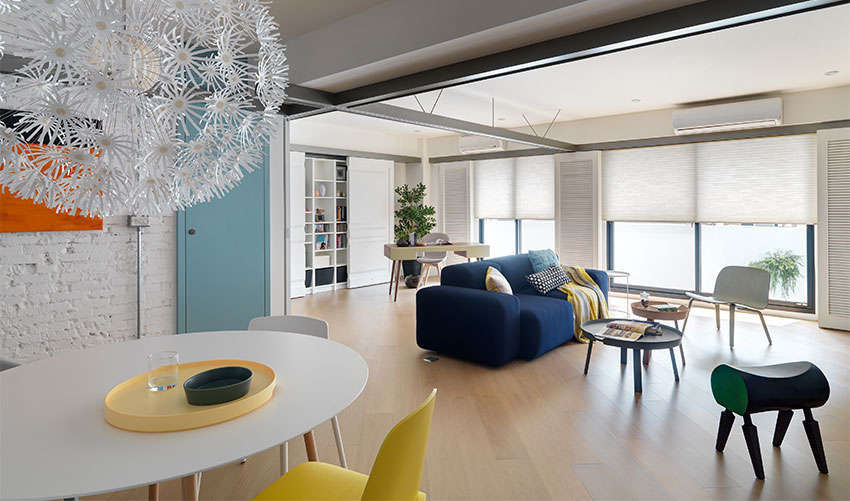 首先改善原本漏水屋況,并將 3 房格局縮減為 2 房,采用開放式規(guī)劃,引入大量自然采光,就連原本處于內(nèi)部的餐廳區(qū)域也一掃陰暗感,同時加入繽紛色彩點(diǎn)綴(白色磚墻、粉藍(lán)色與粉紅色門片、各種色系家具),更加符合屋主喜愛的北歐風(fēng)氛圍。