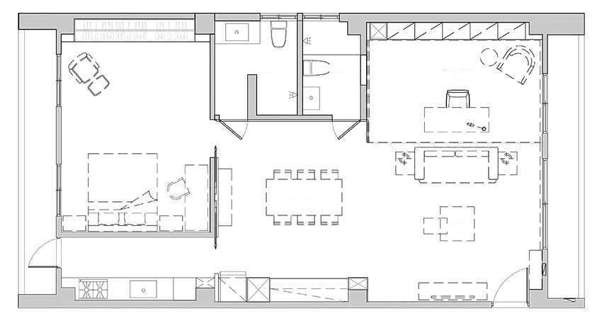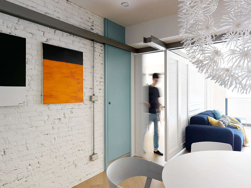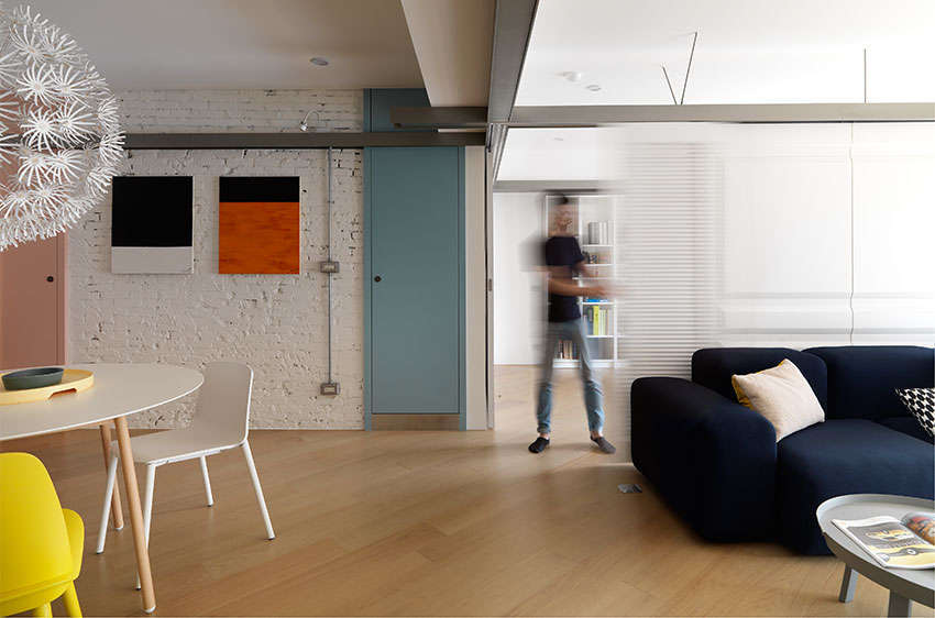 由于只有一人居住,希望空間能彈性靈活使用,除了選擇北歐風(fēng)家具混搭,方便以后隨性自由改變位置外,沙發(fā)后方工作書房也運(yùn)用「萬象軌道」形成時而開放時而獨(dú)立的區(qū)域,這是一般喜宴會議廳常見隔間設(shè)計,軌道本身可轉(zhuǎn)彎,采用進(jìn)口五金比起一般滑門更穩(wěn)固,單手即能推動,透過具有隔音效果門片組合后(門片可訂做為線板、百葉等設(shè)計),又是一間完整私密空間。下次新家改造需要隔間,不妨就按照這樣來打造吧!
