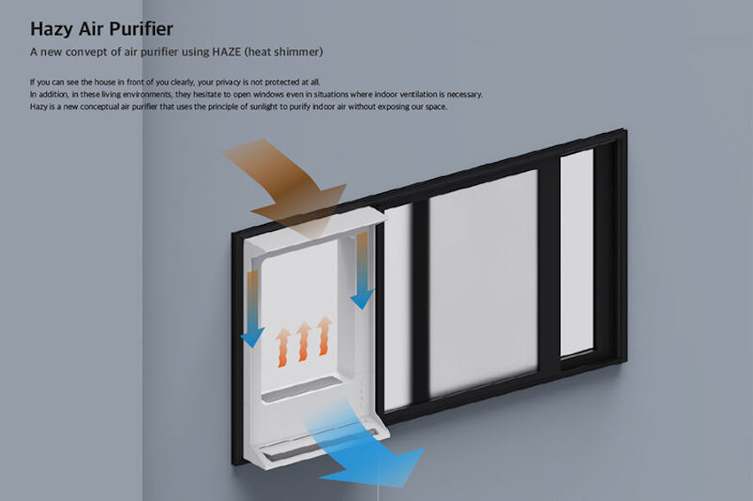 Hazy 空氣凈化窗是一扇能夠確保隱私性的窗戶,能確保在不開窗狀況下,提供適當(dāng)通風(fēng)功能,采用「霧氣」概念,裝置配有一個(gè)通風(fēng)孔與過濾器,利用陽光加熱室內(nèi)空氣,達(dá)到凈化室內(nèi)空氣質(zhì)量效果,同時(shí)透過熱霧形成朦朧屏風(fēng),藉以遮擋鄰側(cè)視線。