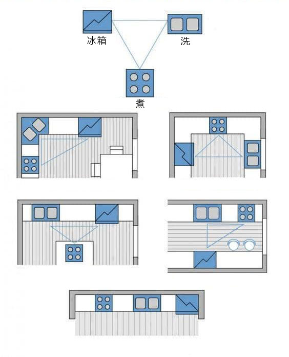 設(shè)計時考慮工作三角,包括冰箱、爐灶和水槽的位置。這些元素應(yīng)該在廚房中形成一個便于工作的三角形,以提高工作效率。