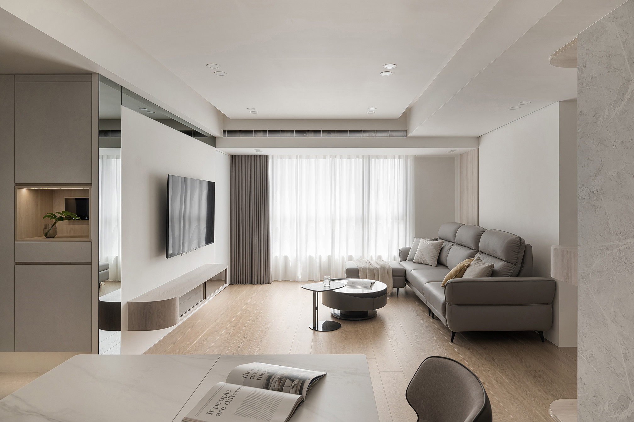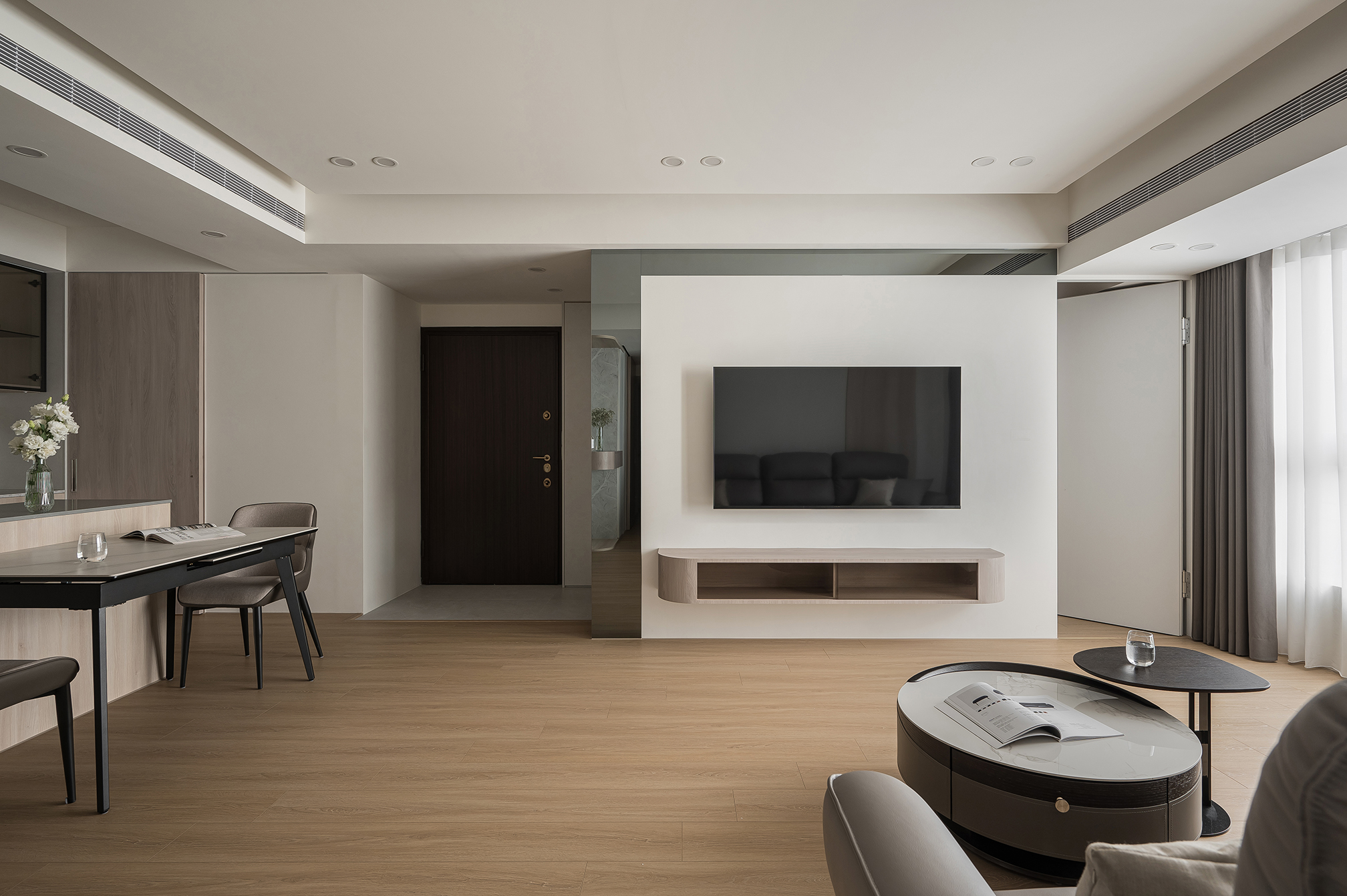 采用原木色地板,與整體色調(diào)搭配,打破單調(diào)感。家具選用簡潔線條的原木色家具,如淡灰色沙發(fā)、茶幾,營造寬敞的客廳空間。