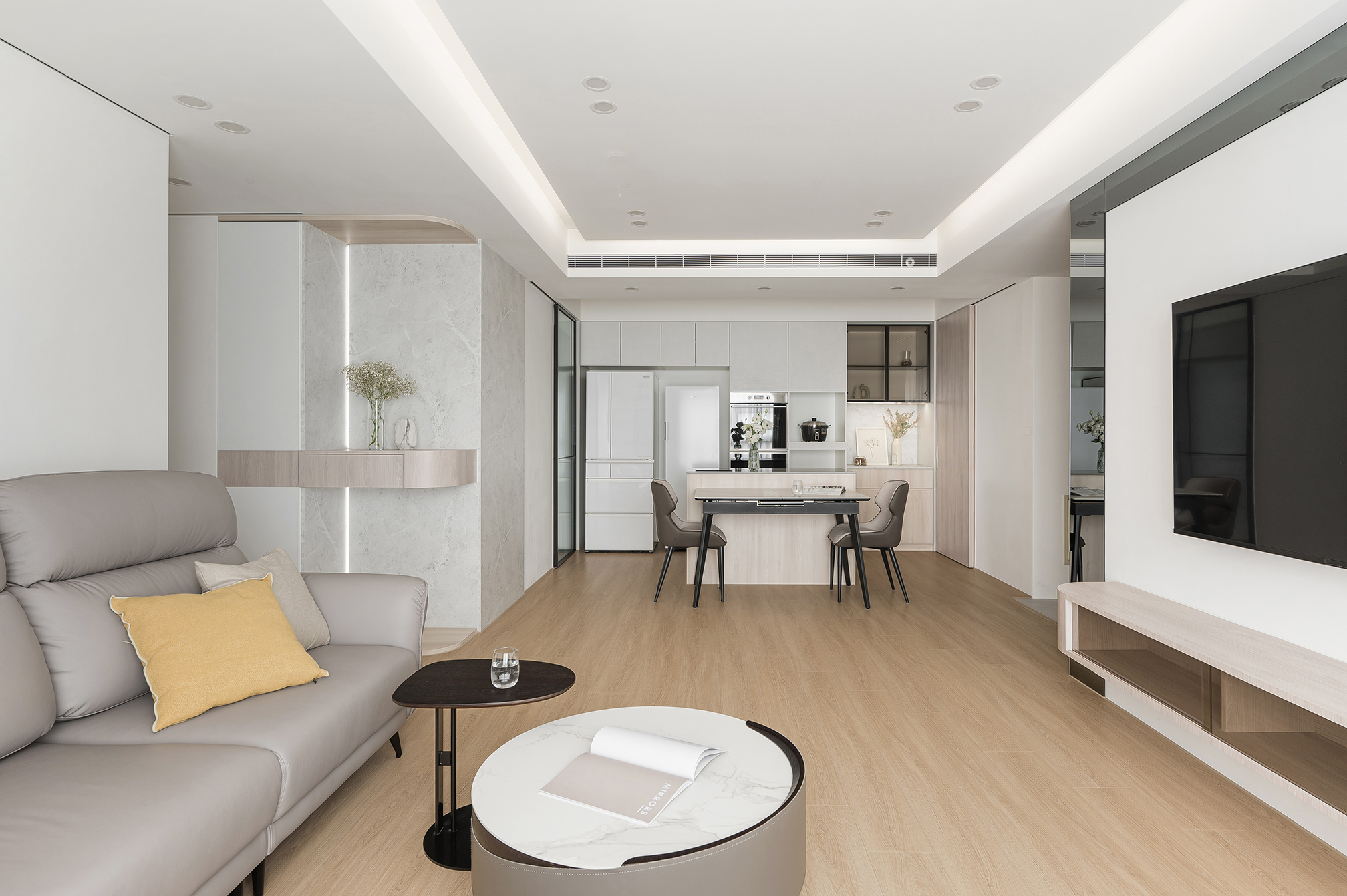 以白色、奶油色和原木色為主調(diào),通過少量的明亮色彩點(diǎn)綴,保持整體空間的清新感。