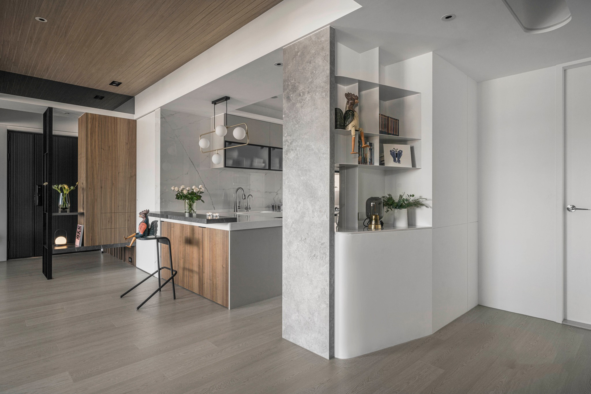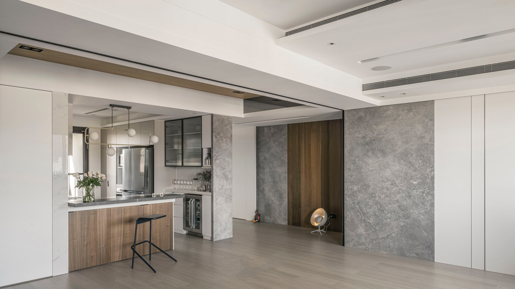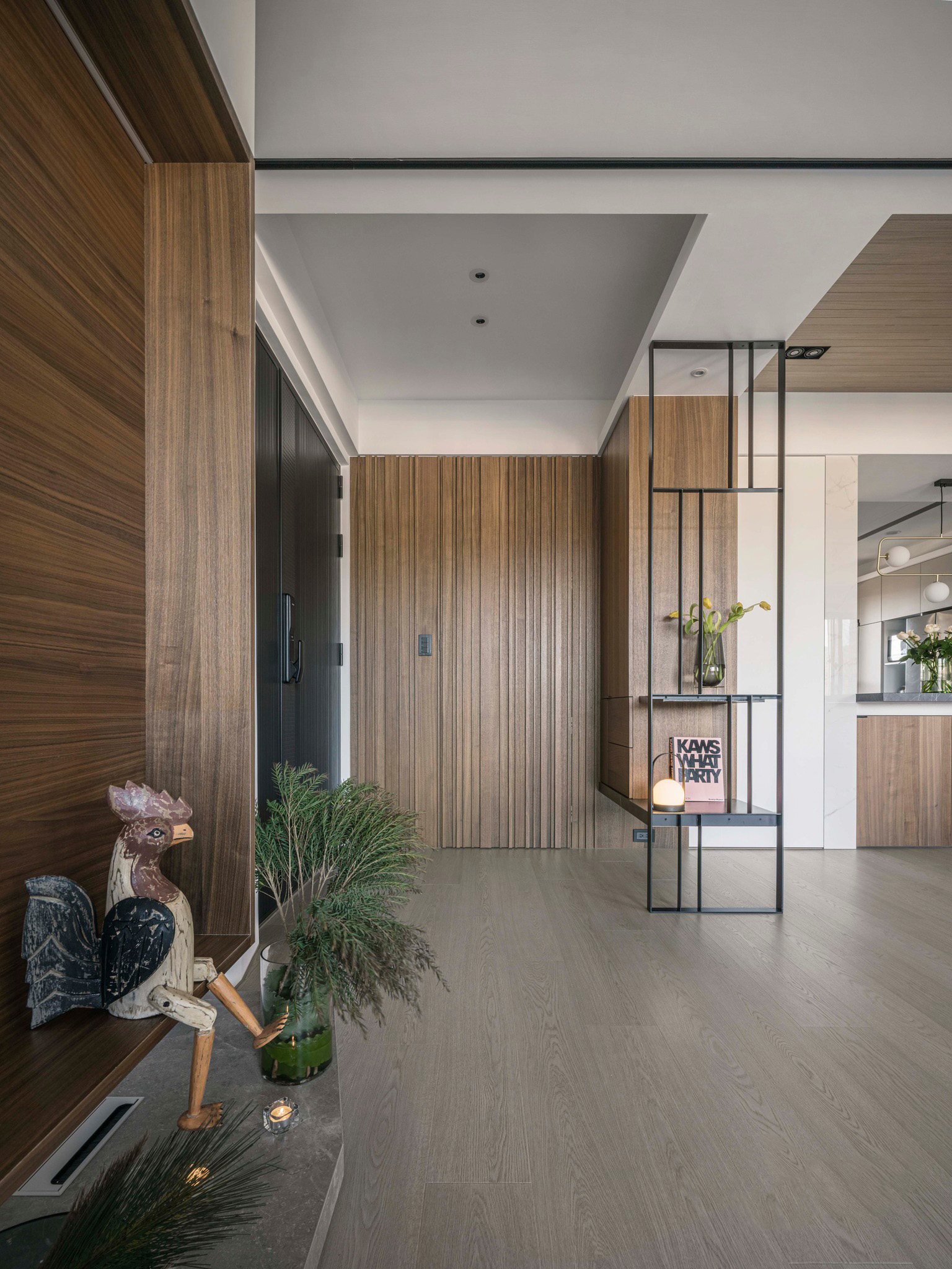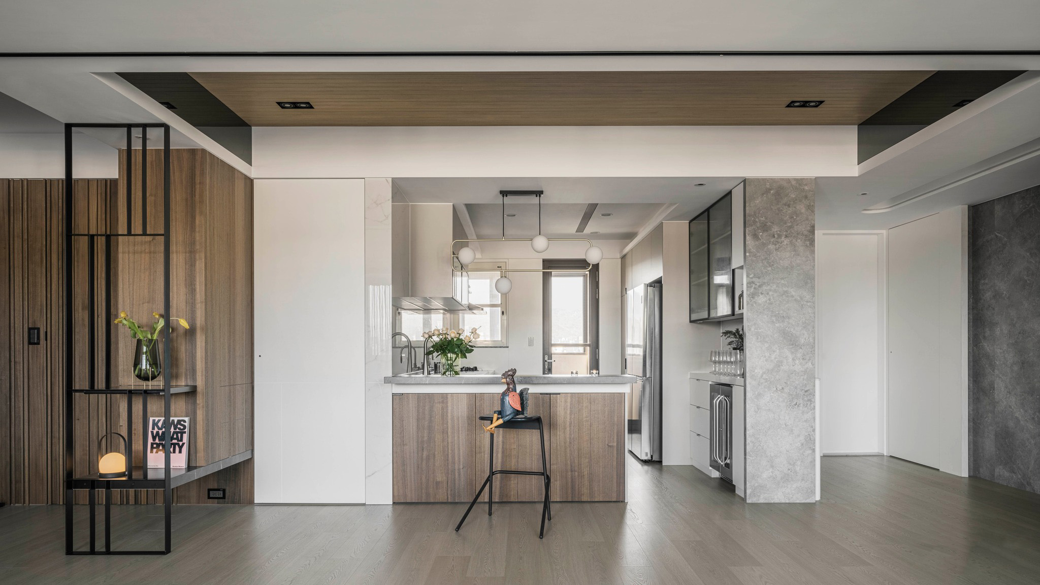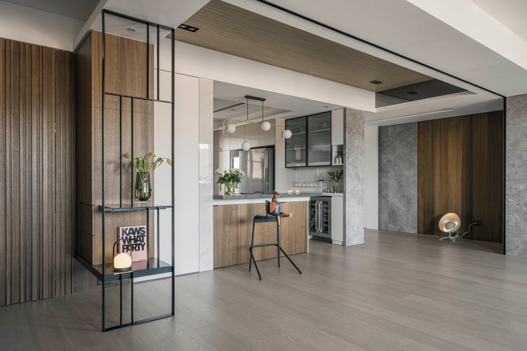 整體空間以溫潤(rùn)的深色木紋和石墻為主軸,展現(xiàn)了內(nèi)斂沉穩(wěn)的中性基調(diào),與業(yè)主深思熟慮的氣質(zhì)相得益彰。整齊劃一的空間線條和梁柱的鏡面材質(zhì),搭配簡(jiǎn)潔利落的造型鐵件,奠定了理性的空間語(yǔ)匯,同時(shí)展現(xiàn)出大氣、開(kāi)闊的視覺(jué)意象。