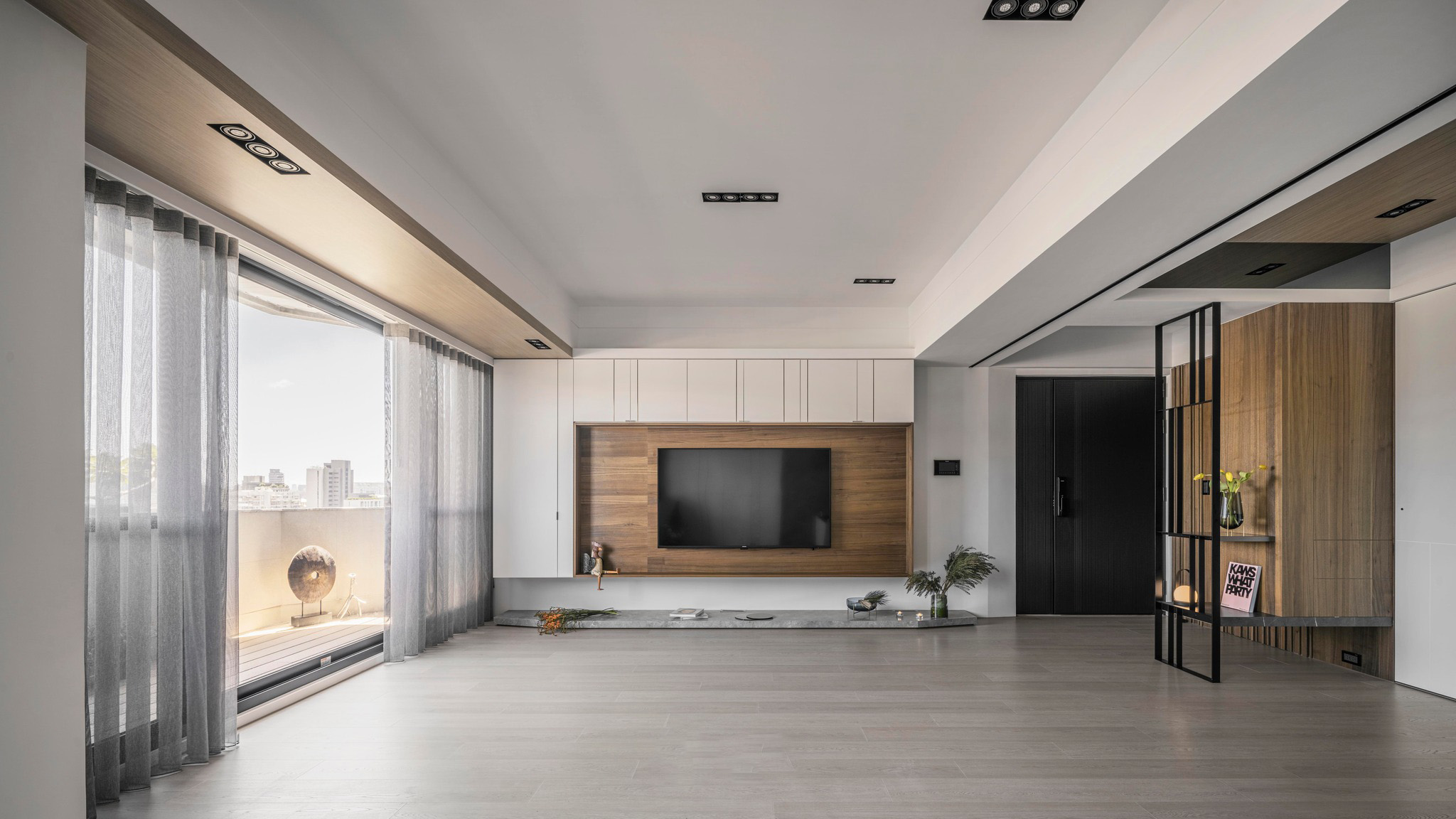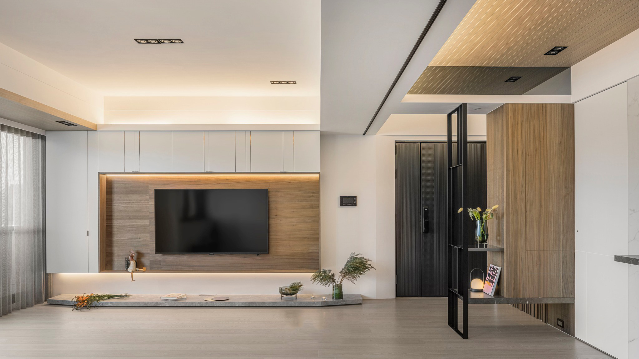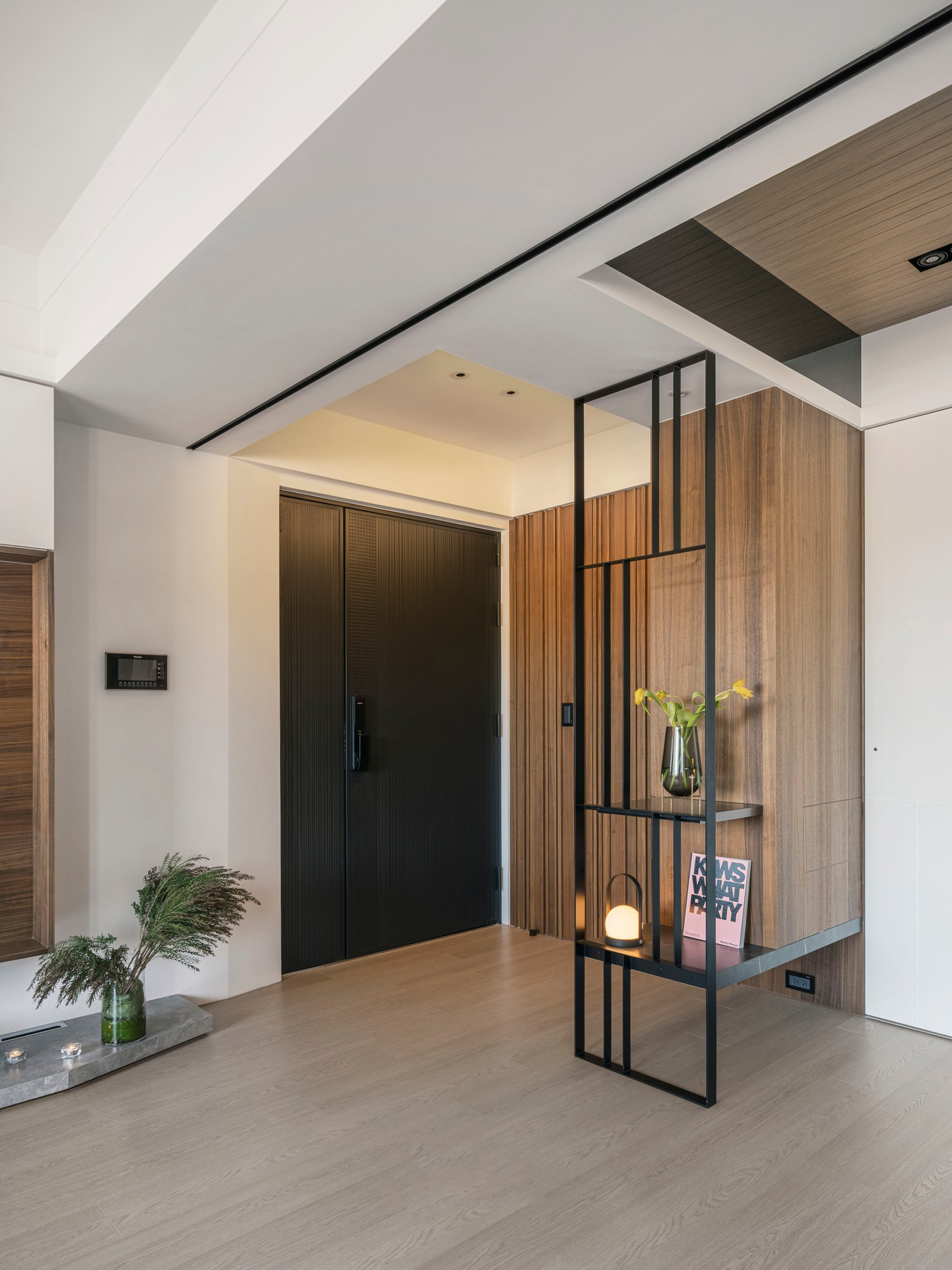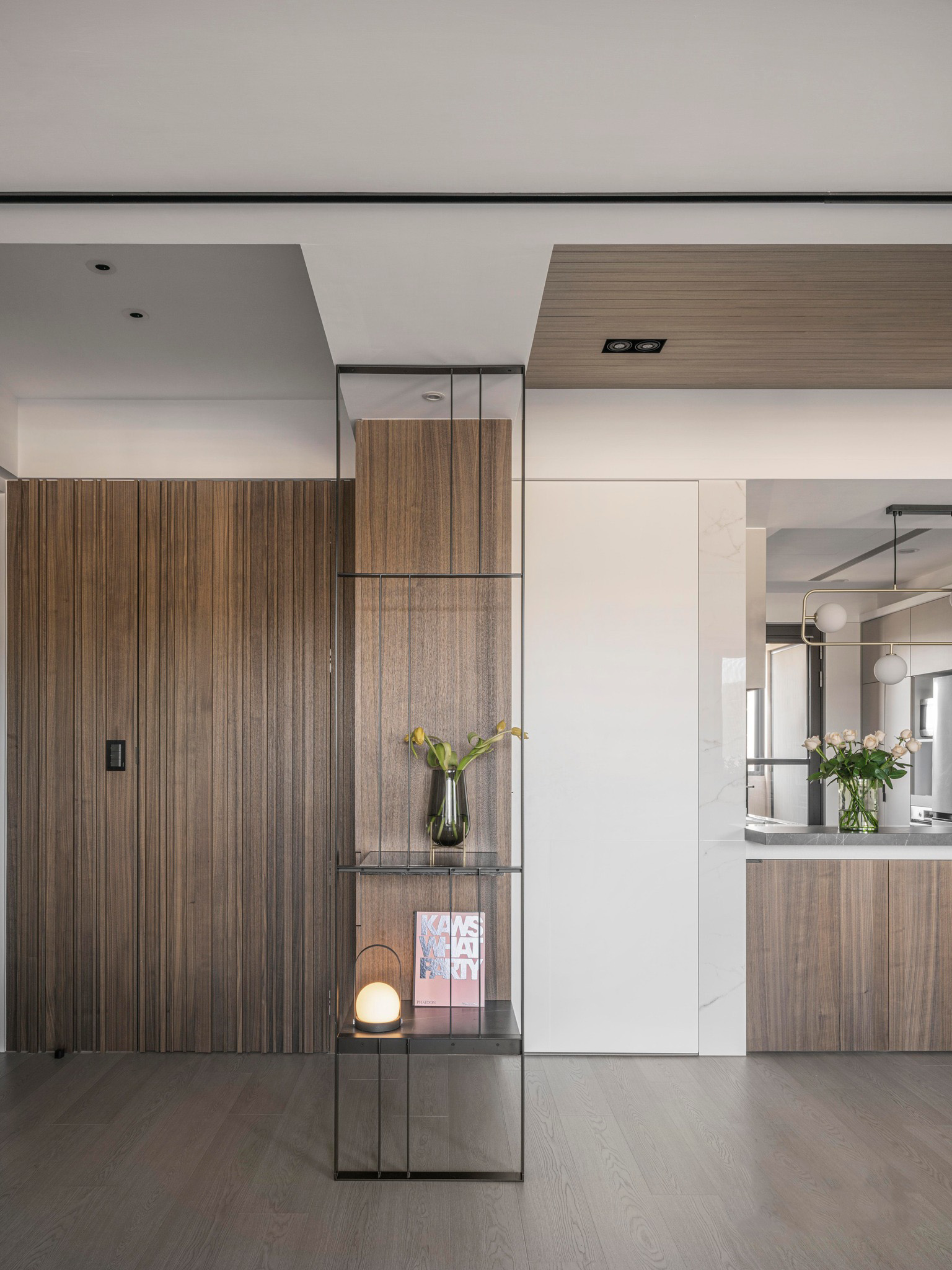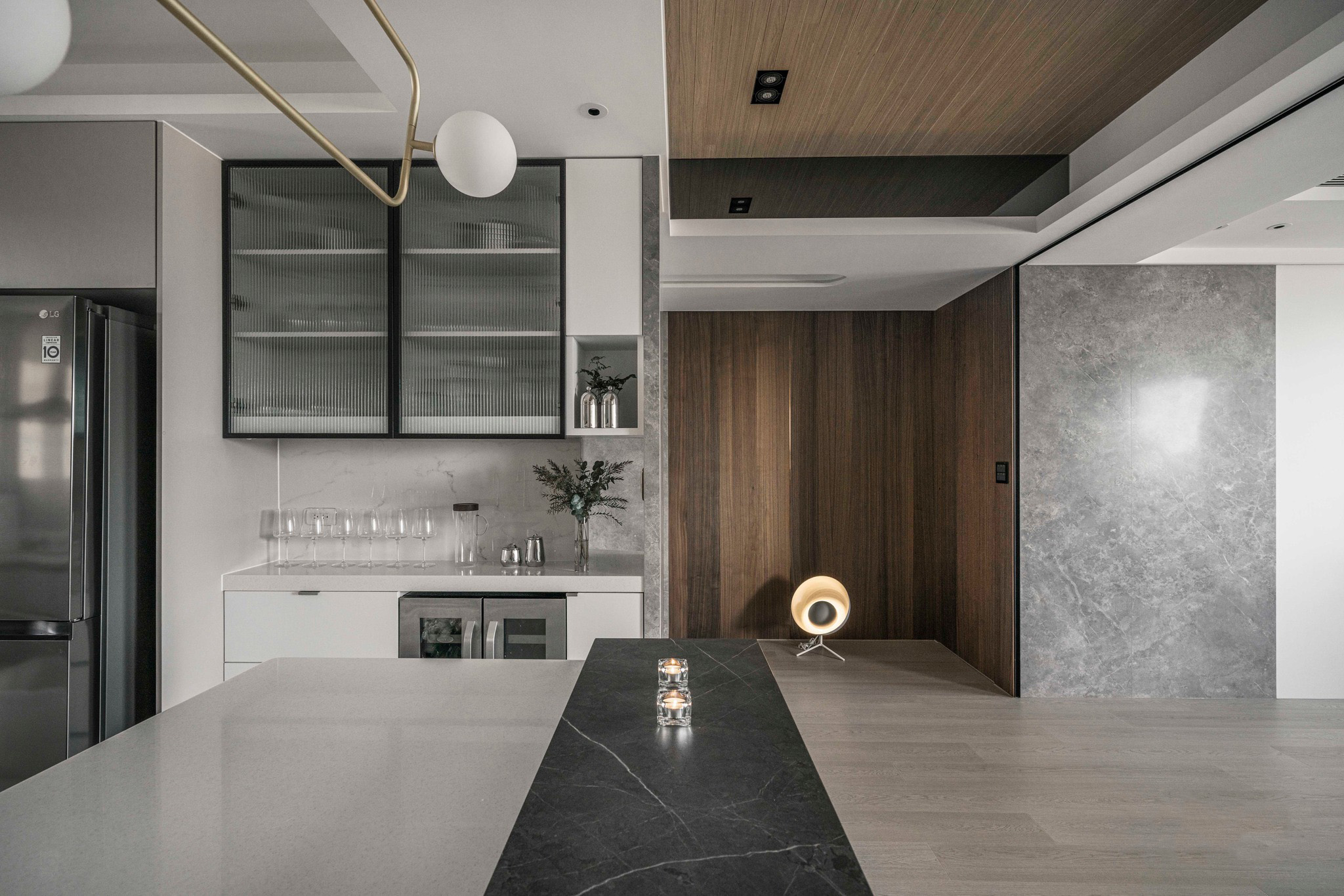 整體空間以溫潤(rùn)的深色木紋和石墻為主軸,展現(xiàn)了內(nèi)斂沉穩(wěn)的中性基調(diào),與業(yè)主深思熟慮的氣質(zhì)相得益彰。整齊劃一的空間線條和梁柱的鏡面材質(zhì),搭配簡(jiǎn)潔利落的造型鐵件,奠定了理性的空間語(yǔ)匯,同時(shí)展現(xiàn)出大氣、開(kāi)闊的視覺(jué)意象。