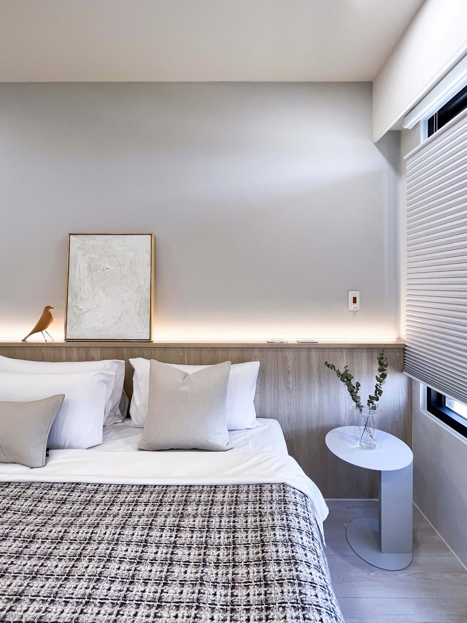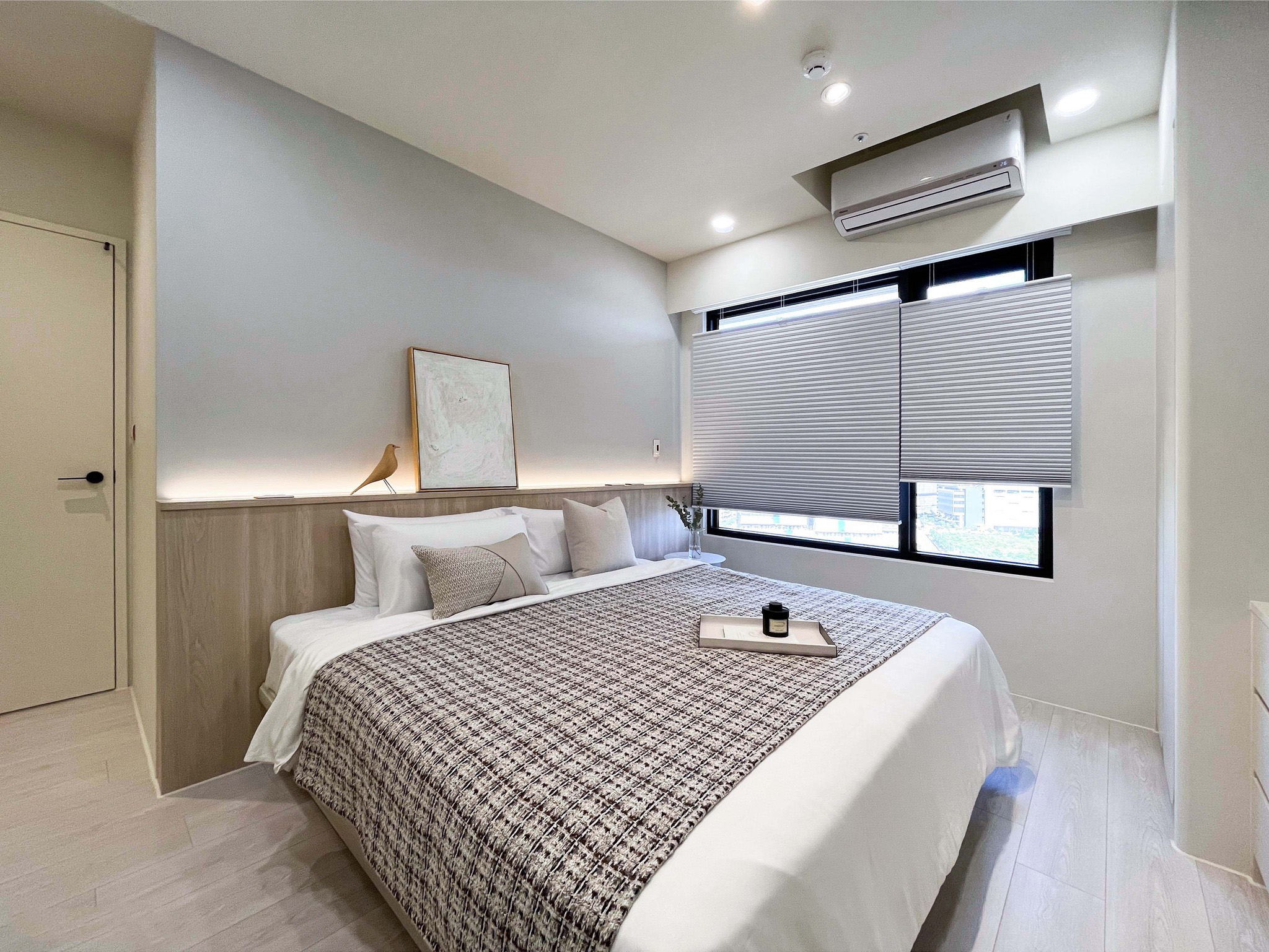 木地板和原木墻裙的自然材質(zhì)打破了單調(diào),為空間增添了溫暖和親近感,讓居住者在這個(gè)簡約而精致的臥室中感受到寧靜與美好。