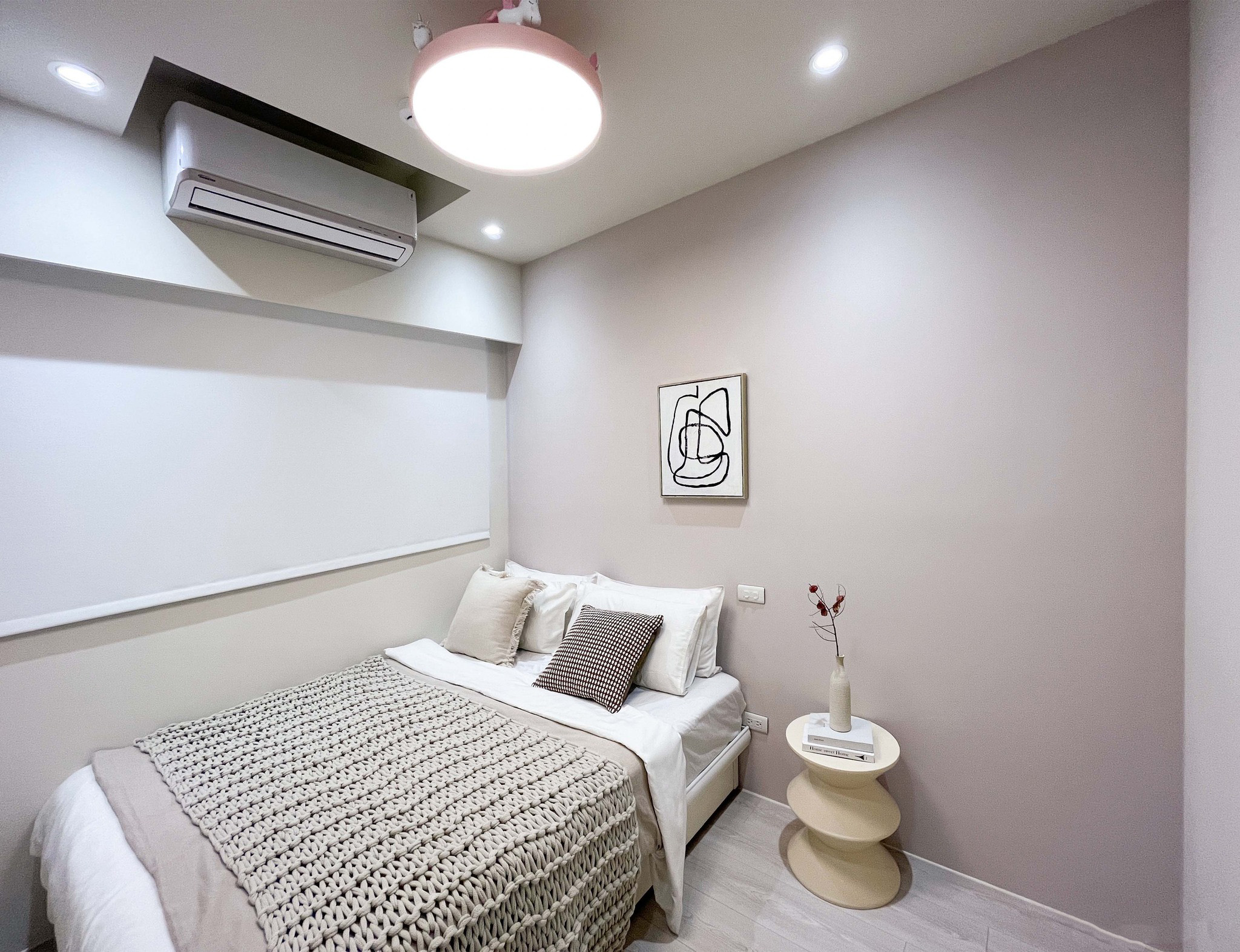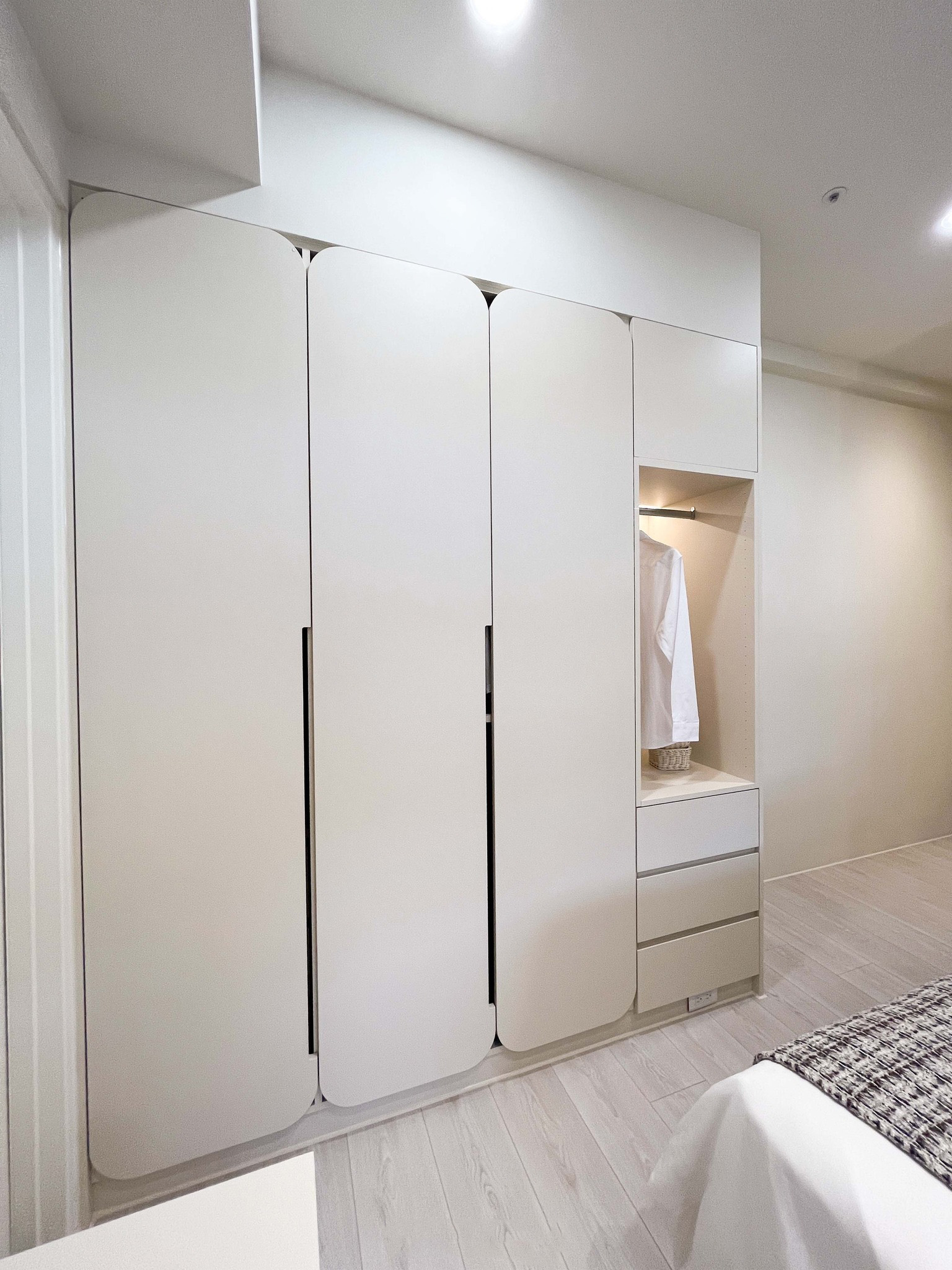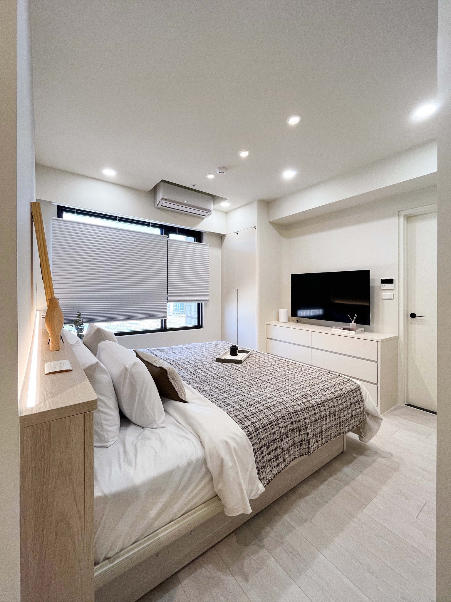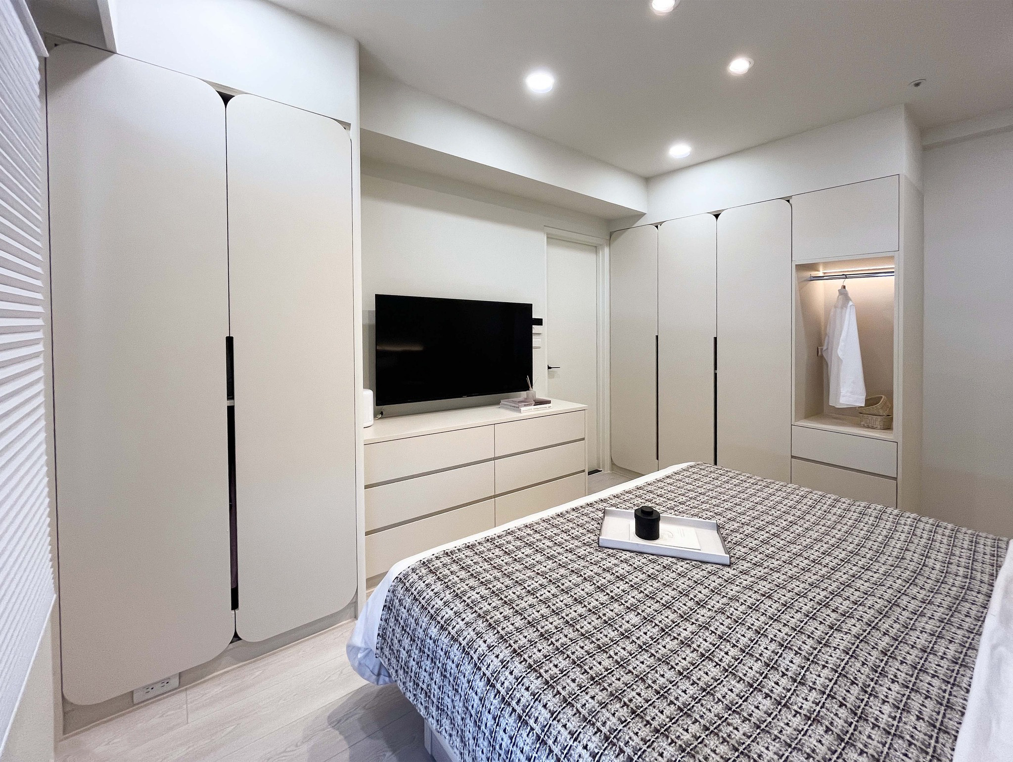 室內(nèi)的設(shè)計(jì)注重極簡風(fēng)格,通過大型衣柜和活動(dòng)式風(fēng)琴窗簾的巧妙搭配,既提高了收納空間的利用率,同時(shí)也為臥室注入了一份時(shí)尚與舒適的氛圍。